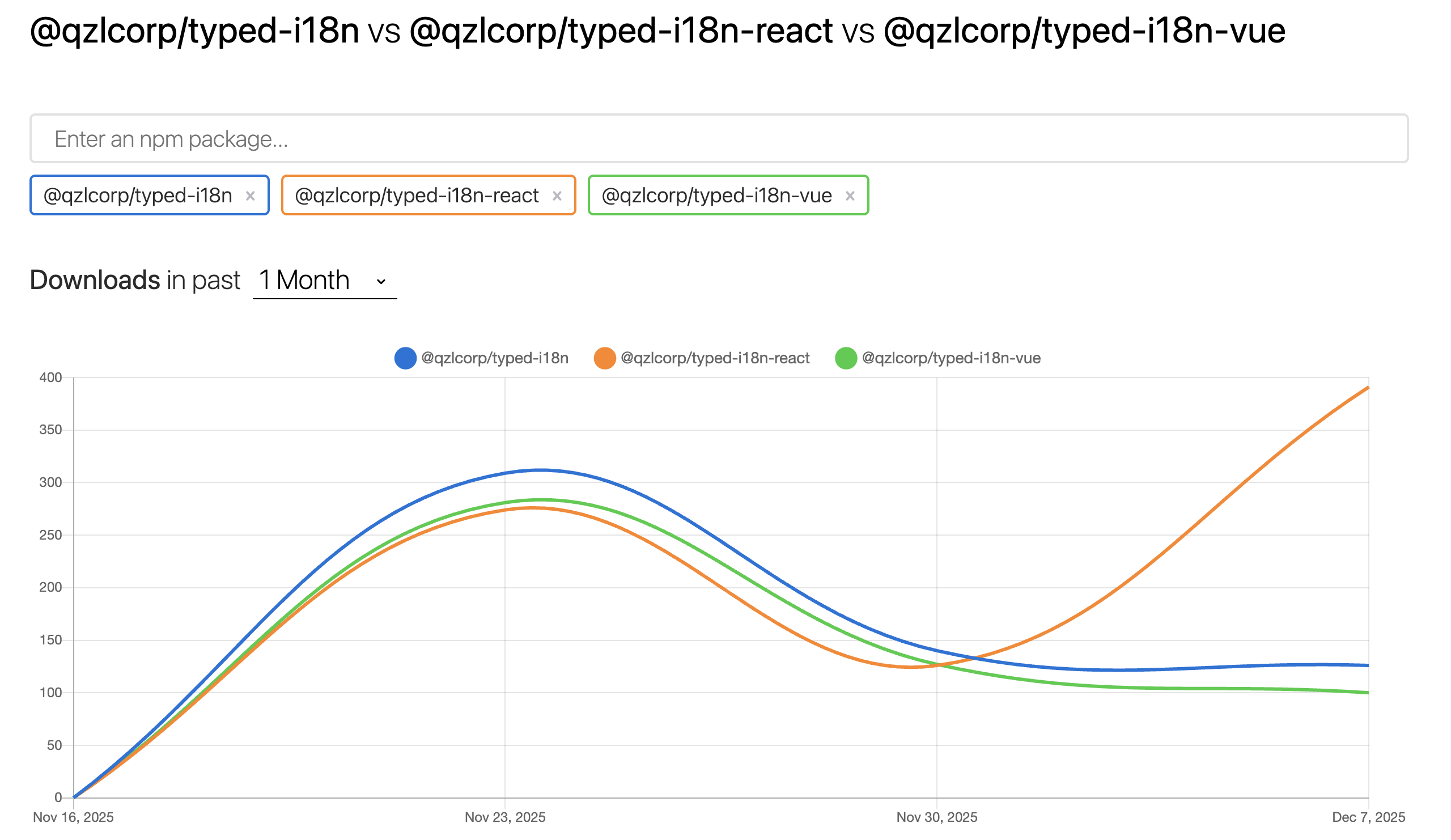 @qzlcorp/typed-i18n-reactsees 391 weekly downloads — wow, what a courage number! 💪@qzlcorp/typed-i18nand@qzlcorp/typed-i18n-vueare also seeing increasing usage, showing developers are embracing typed i18n solutions.